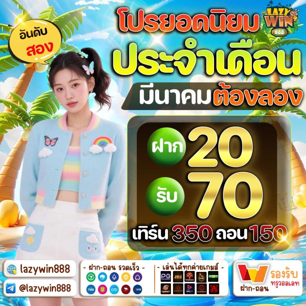 ฝาก 20 รับ 70 ทำยอด 350 ถอน 150 เรียกเป็นโปรที่มีการรับเยอะเเล้วถอน ใช้เงินลงทุนต่ำมาก รับโปรเพือเพิ่มโอกาสในการแก้เกม โปรนี้เหมาะมากสำหรับ “การปั้นระยะสั้น”