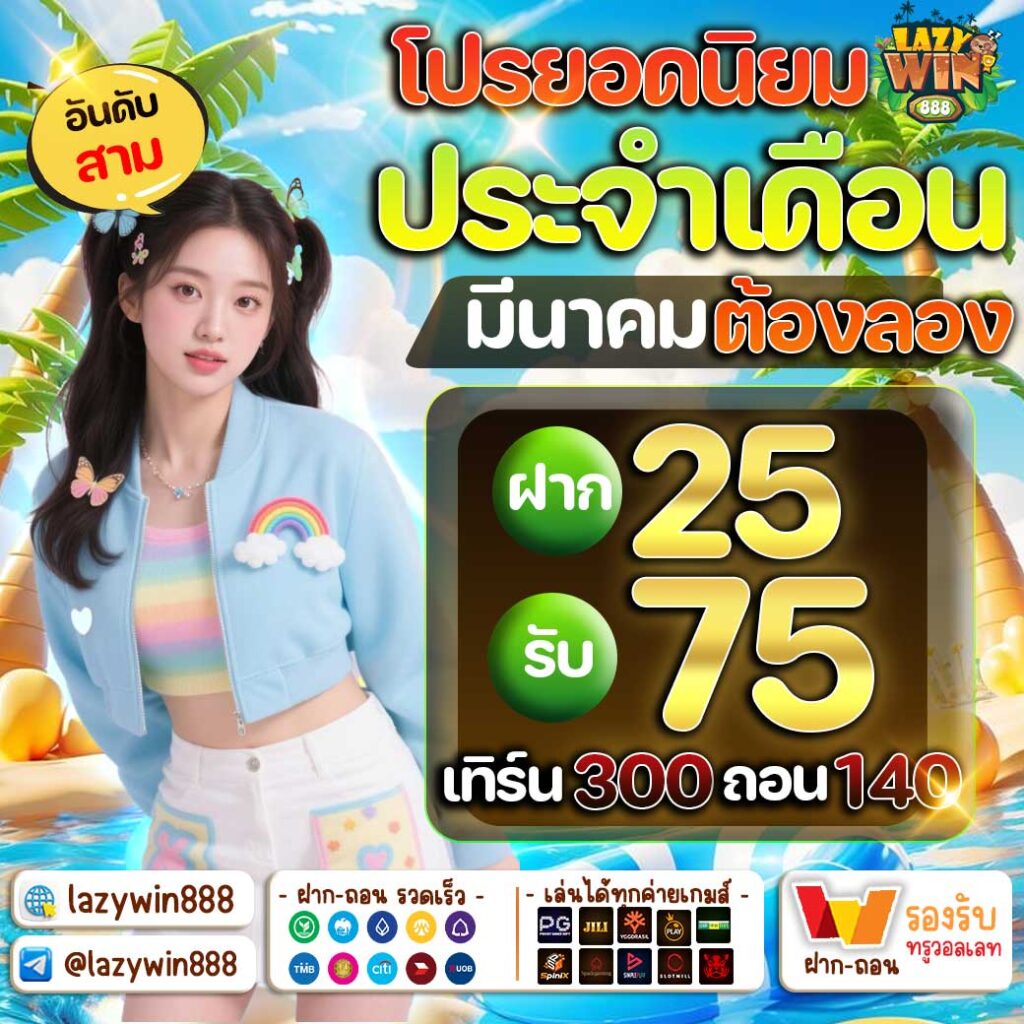 ฝาก 25 รับ 75 ทำยอด 300 ถอน 140 เหมาะกับมือใหม่ เงื่อนไขไม่ซับซ้อน ยอดเทิร์นยอดสะสมไม่สูงจนเกินไป ทำให้ไม่ต้องแช่อยู่ในเกมนานเกินไปจนกำไรที่ทำได้หายหมด